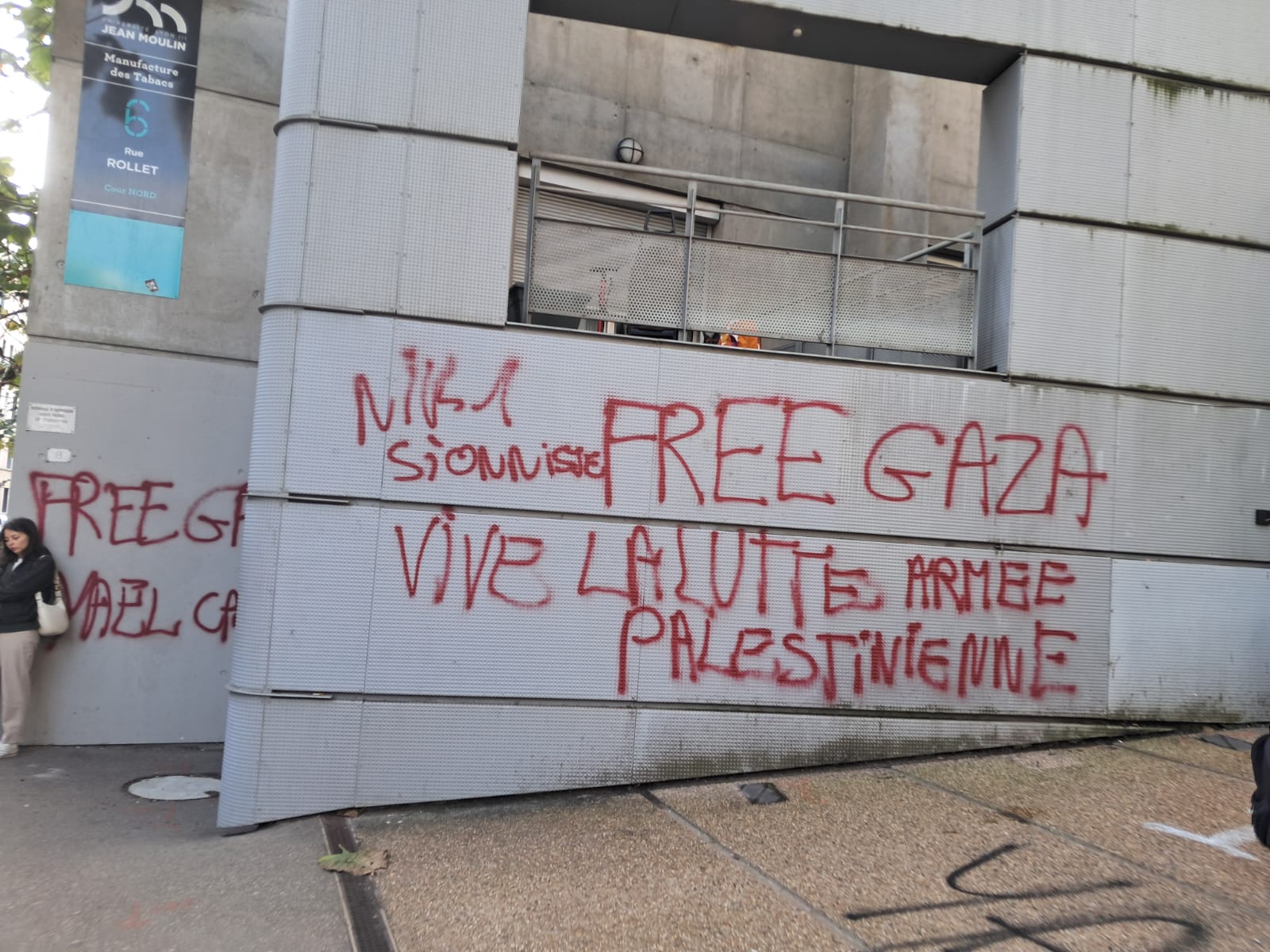 Les inscriptions "Free Gaza" et "vive la lutte armée" figuraient parmi les messages inscrits sur les murs.