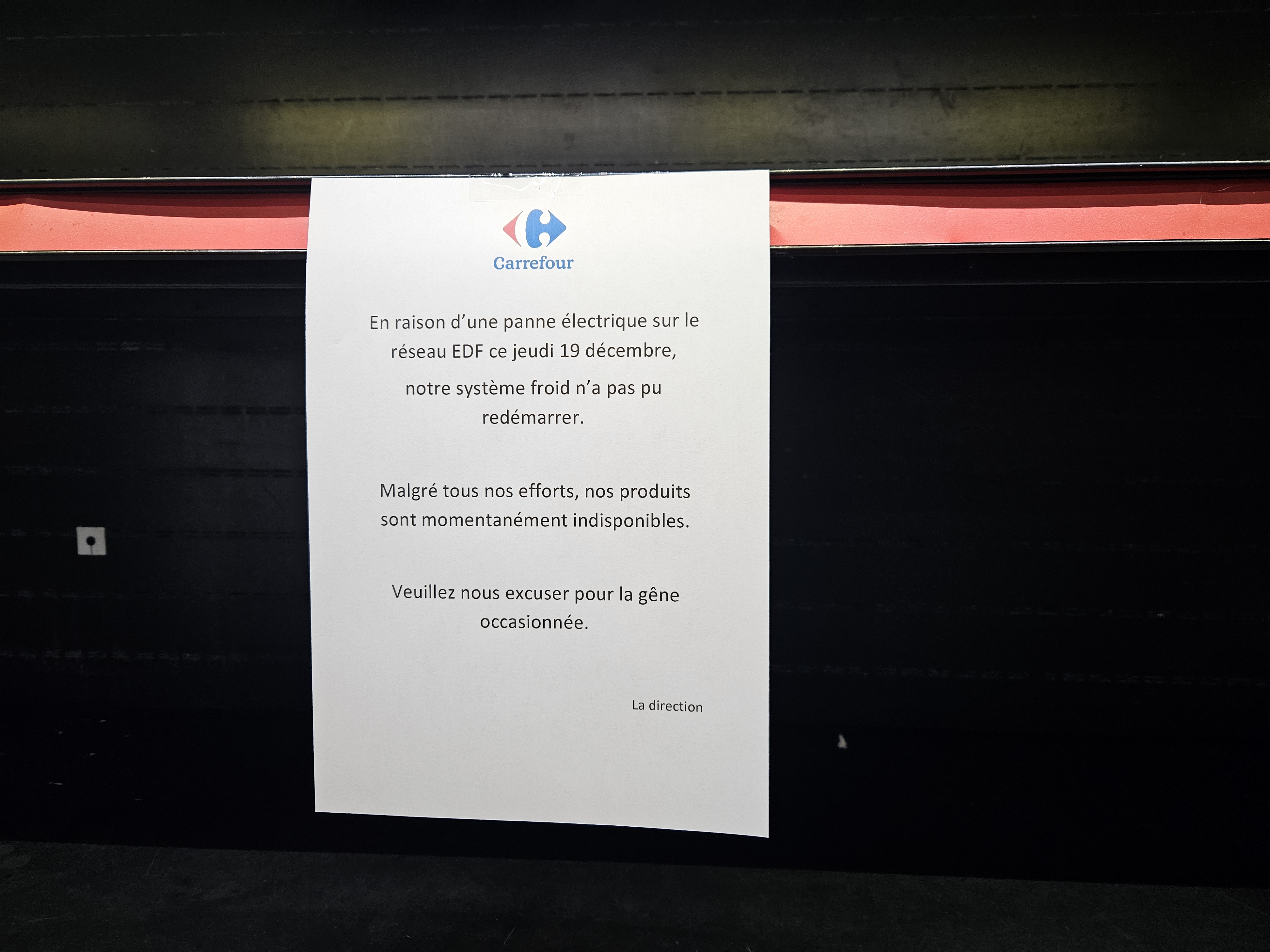 Une panne d’électricité a contraint de nombreux magasins à la fermeture pendant quelques heures jeudi. Conséquence de cet incident, le système de froid du supermarché Carrefour n’a pas pu redémarrer. Et l’enseigne a dû fermer l’ensemble de ses rayons frais ce vendredi.