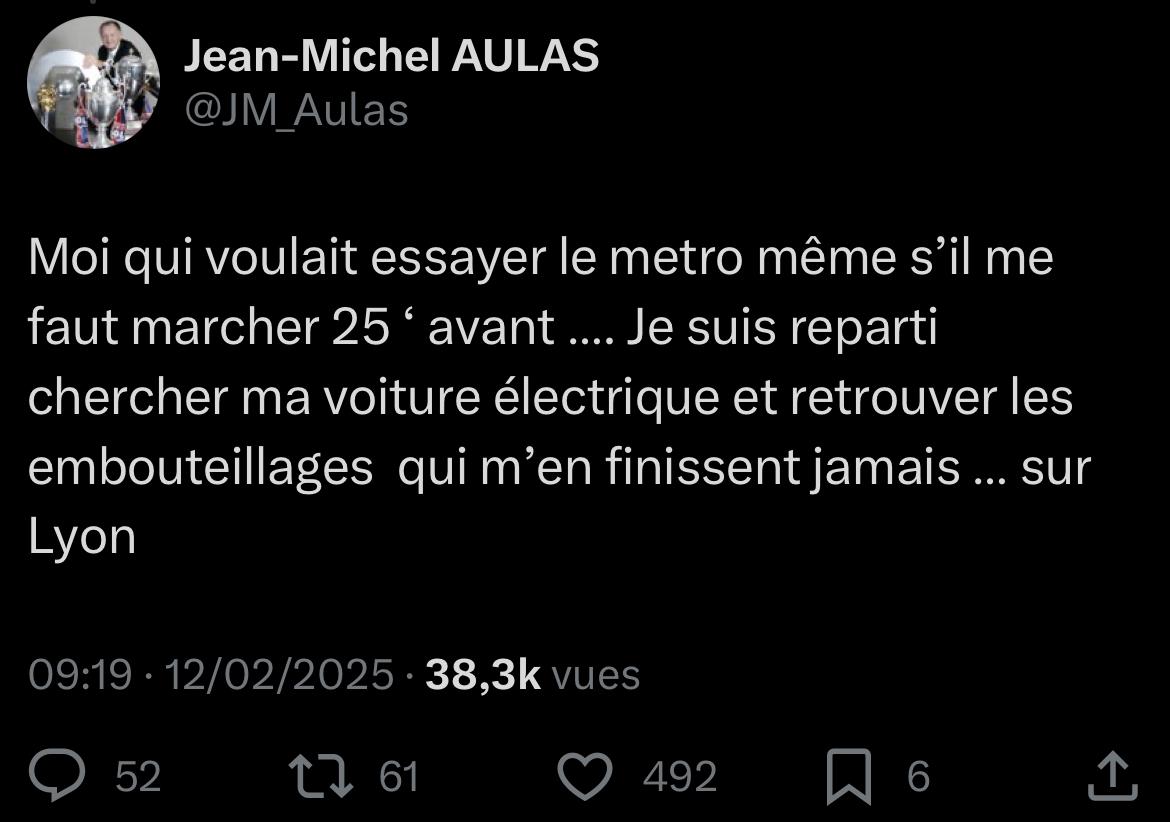 Sur X (ex-Twitter), il a publié un message sarcastique : "Moi qui voulais essayer le métro même s'il me faut marcher 25' avant... Je suis reparti chercher ma voiture électrique et retrouver les embouteillages qui n'en finissent jamais... sur Lyon."