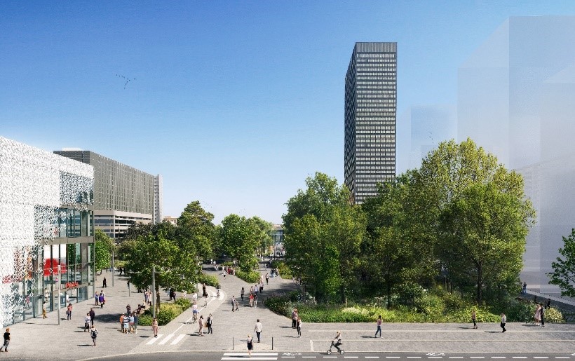 Le bois se divisera en deux parties : au nord, une esplanade végétalisée longeant la bibliothèque municipale et le centre commercial, intégrant une piste cyclable et un large passage piéton vers la gare. Au sud, des bosquets denses seront plantés sur l’actuelle parcelle de France Télévisions, avec de jeunes plants favorisant une croissance rapide.