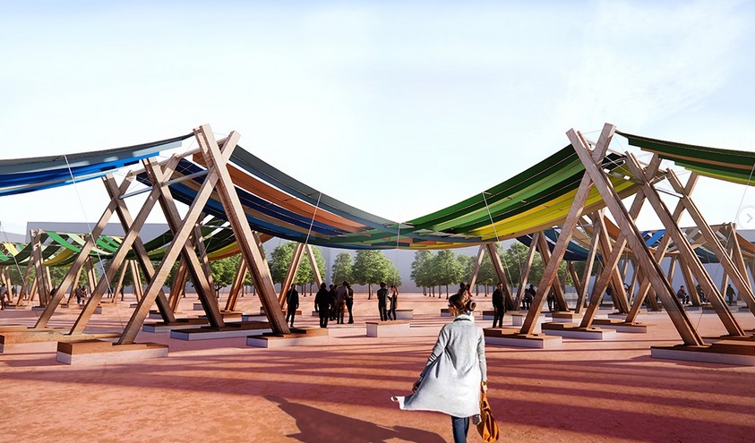 Pour rappel, l'oeuvre consistera en de grandes arches de bois qui soutiendront des drapés de couleur suspendus. Un clin d'oeil aux métiers à tisser des canuts.