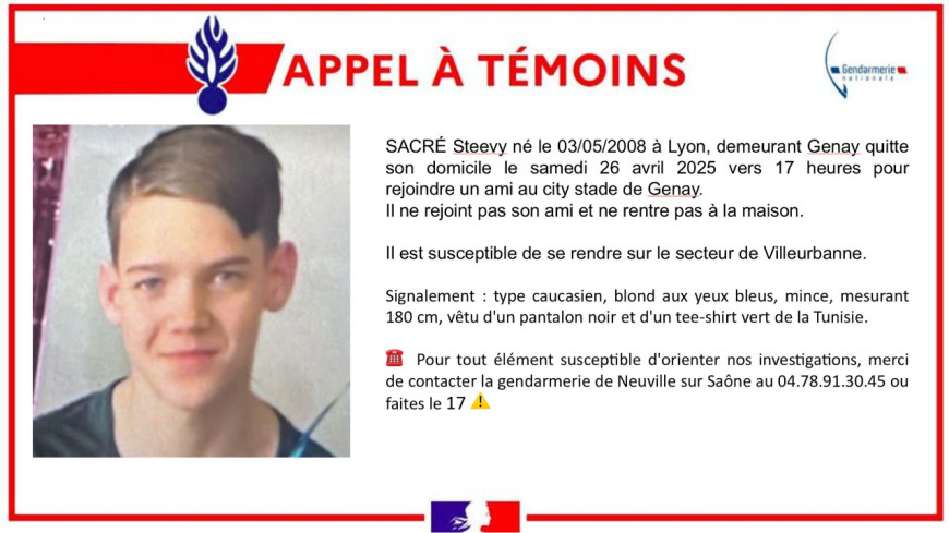 Un appel à témoins a été lancé par la gendarmerie du Rhône. Selon les enquêteurs, Steevy est susceptible de se rendre à Villeurbanne.