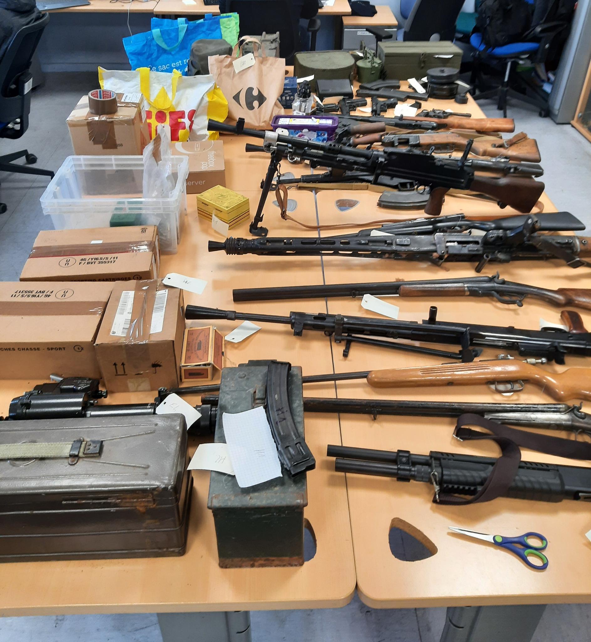 Lors de la visite domiciliaire autorisée par un juge des libertés et de la détention, les agents de la DNRED ont découvert "une dizaine d’armes de diverses catégories, notamment des armes de catégorie A (arme de guerre, ndlr) correspondant à une mitrailleuse, des fusils mitrailleurs et pistolets mitrailleurs".