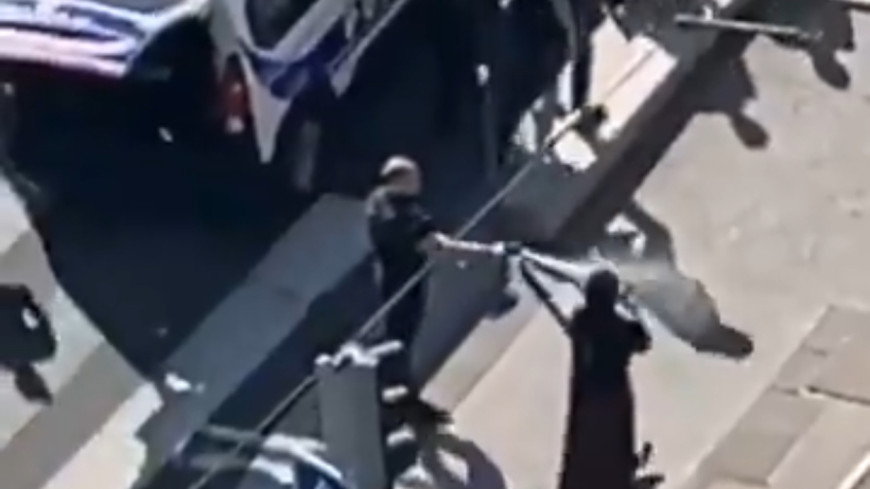 Là, on voit juste un jeune se faire un peu tirer par les cheveux (il aura un peu mal pendant 2 jours), la jeune femme se prend un coup de gazeuse mais parce qu'elle crie et revient à la charge... le policier emploie donc une riposte proportionnée, elle va juste un peu pleurer et cracher, mais elle s'en remettra...