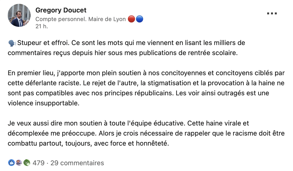 Face à cette avalanche de réactions, le maire de Lyon a tenu à répondre dès le lendemain. "Stupeur et effroi. Ce sont les mots qui me viennent en lisant les milliers de commentaires reçus depuis hier sous mes publications de rentrée scolaire," a écrit Grégory Doucet.