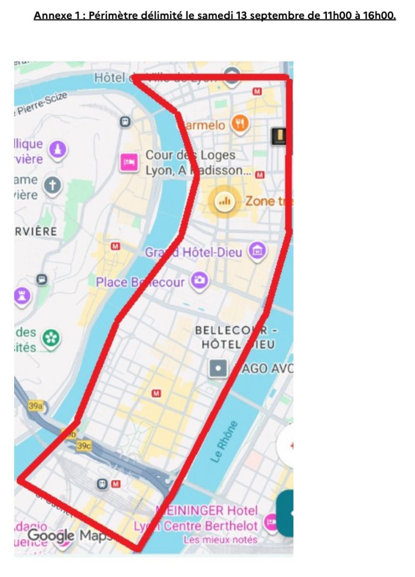 Pour encadrer cette mobilisation, la préfecture du Rhône a pris des mesures. Dans un arrété du 12 septembre les services de l'État précisent que "le seul moyen de préserver la sécurité des personnes et des biens, au regard des forces de sécurité mises à disposition pour la journée du samedi 13 septembre 2025, consiste à établir un périmètre d'interdiction limité aux rues suivantes de 11h00 à 23h00 : Cours Suchet ; Quai du Docteur Gailleton ; Quai Rambaud & quai du Maréchal Joffre ; rue de la Martinière, rue Sainte-Catherine, rue Romarin, rue Désirée, place Louis Pradel."