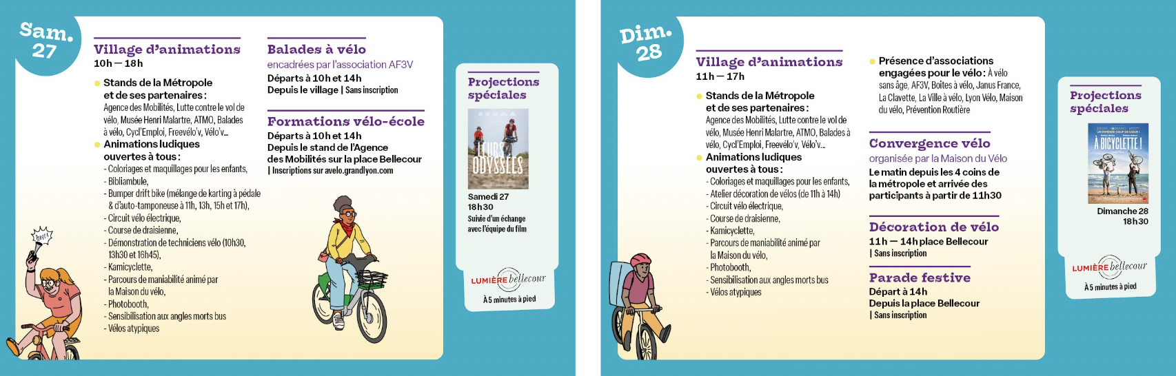 Les amateurs de cinéma auront eux rendez-vous au Lumière Bellecour pour deux séances spéciales autour du vélo avec “Leur Odyssée” de Sophie Gateau et “À bicyclette” de Mathias Mlekuz. Enfin, la bourse aux vélos permettra de donner une seconde vie à son deux-roues ou de trouver une nouvelle monture.