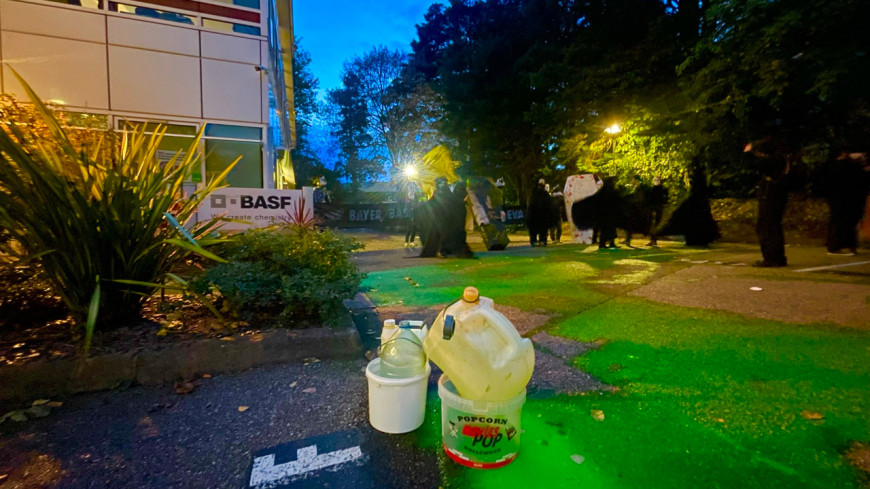 "Via sa division Agro, BASF, leader de l'industrie chimique, empoisonne les sols, l'eau et notre alimentation. Halloween ou pas, les agissements de l'agrobusiness ont de quoi faire peur", justifient les activistes écologistes qui ont déversé de la peinture verte sur le parking, installé de faux cercueils et déployé des banderoles.