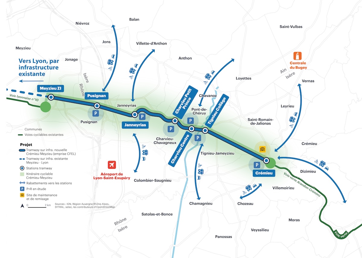 La ligne comprendrait six nouvelles stations, avec des aménagements multimodaux et des connexions vers les bassins de vie voisins. En parallèle, un itinéraire cyclable reliera les voies existantes entre l’est de Crémieu et l’ouest de Meyzieu.