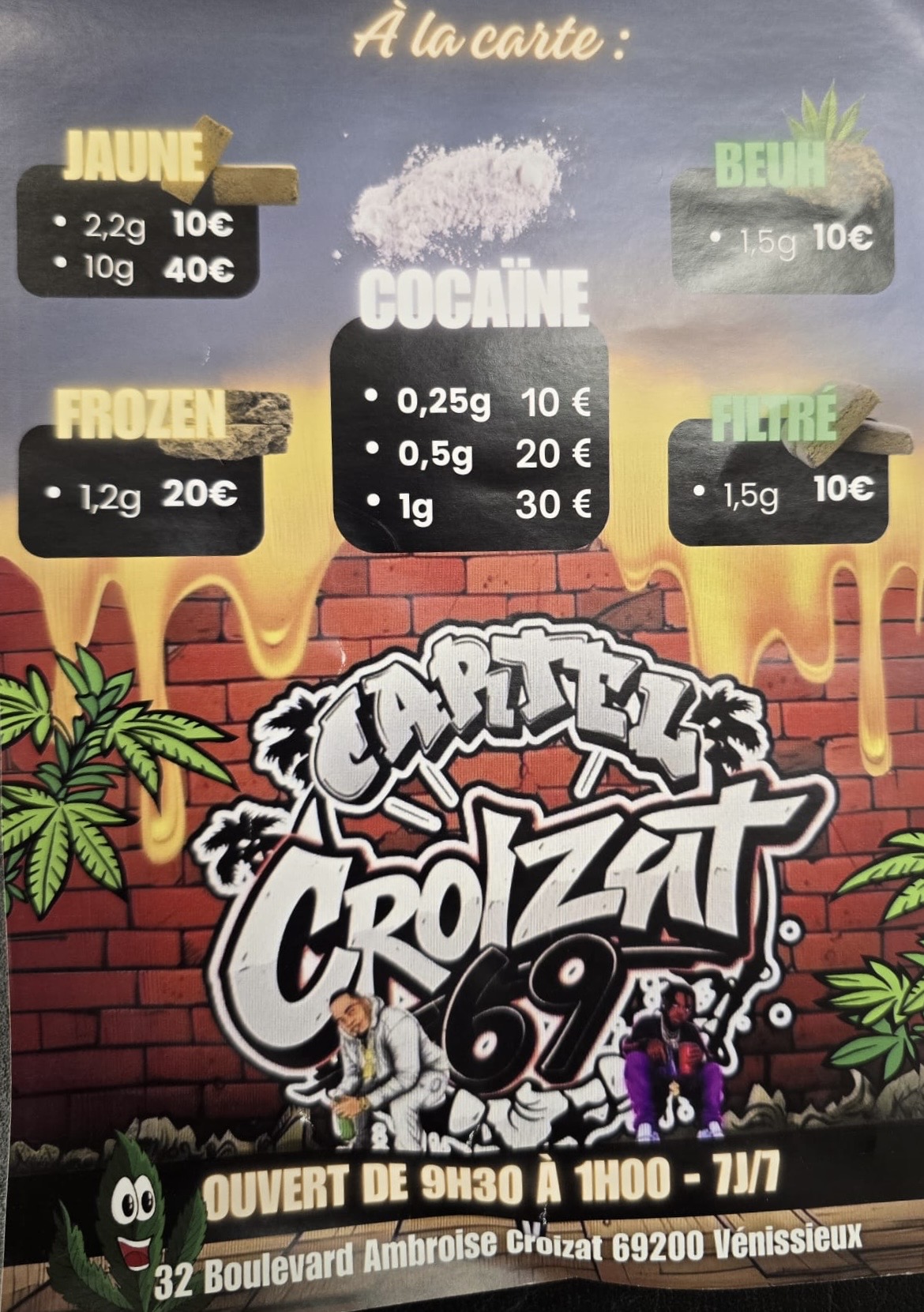 Au 32 boulevard Ambroise-Croizat, un point de deal bien connu du quartier, des habitants ont vu circuler des flyers au ton ouvertement provocateur. Sur ces feuillets, un titre choc : "Cartel Croizat", assorti d’un véritable "menu" tarifé de produits stupéfiants.