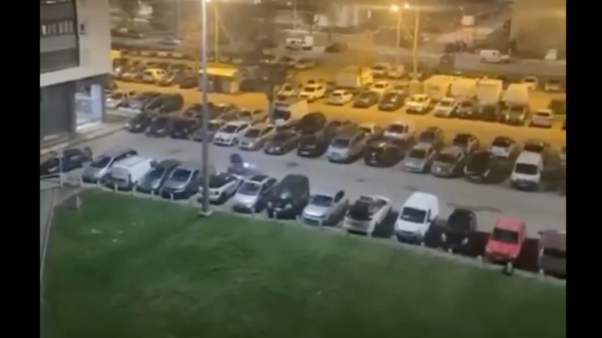 Sur ces images filmées par une habitante de Vénissieux, on voit le scooter se faufiler sur un parking, puis le passager ouvrir le feu. Plusieurs véhicules ont été criblés de balles.