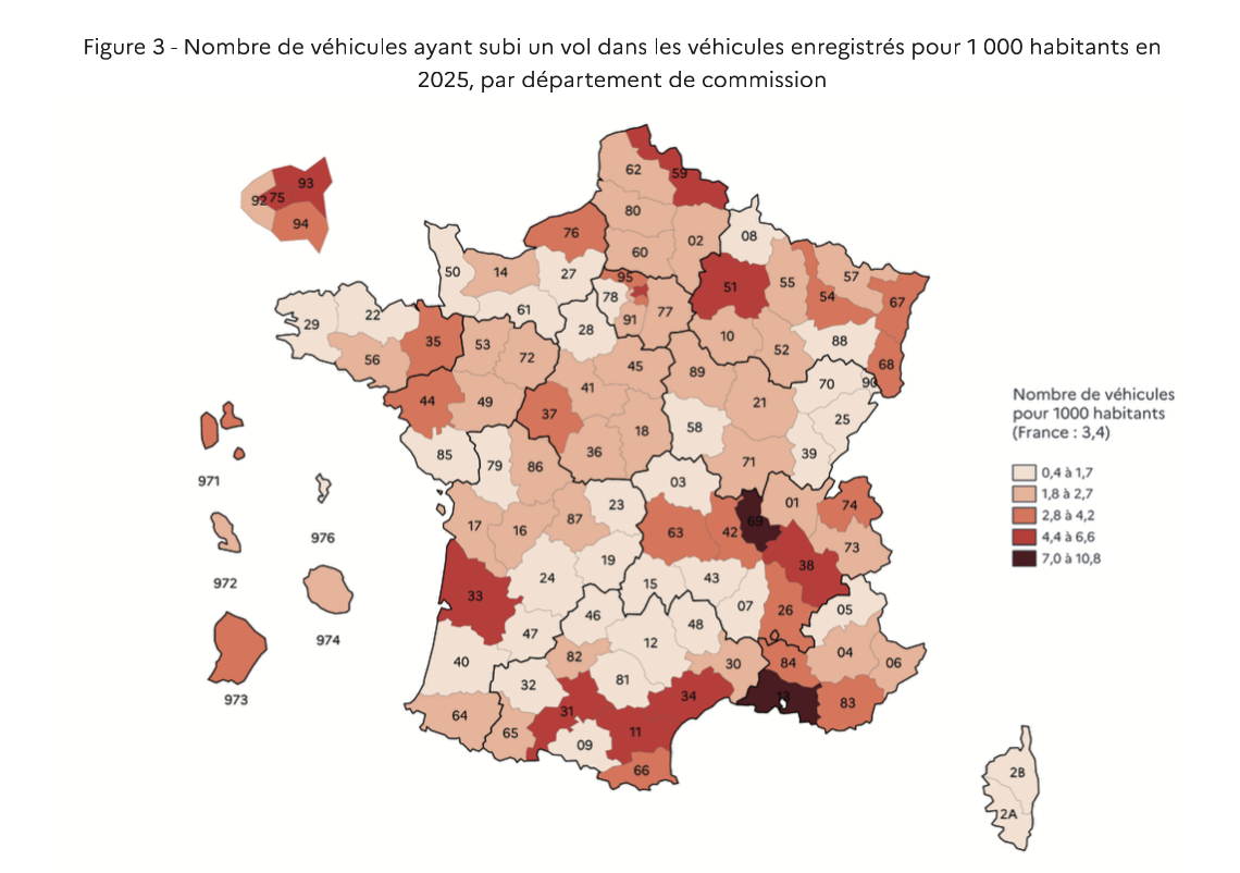 Les vols liés aux véhicules atteignent également des niveaux records. Les vols dans les véhicules progressent de 16,4 % en 2025, avec 20 649 faits recensés. Un chiffre qui place le Rhône en tête, largement devant les Bouches-du-Rhône, deuxième département le plus touché avec 14 579 faits. Le taux s’établit à 10,8 pour 1 000 habitants, contre 3,4 en moyenne en France. Les vols d’accessoires sur véhicules reculent légèrement, mais restent presque deux fois supérieurs à la moyenne nationale.