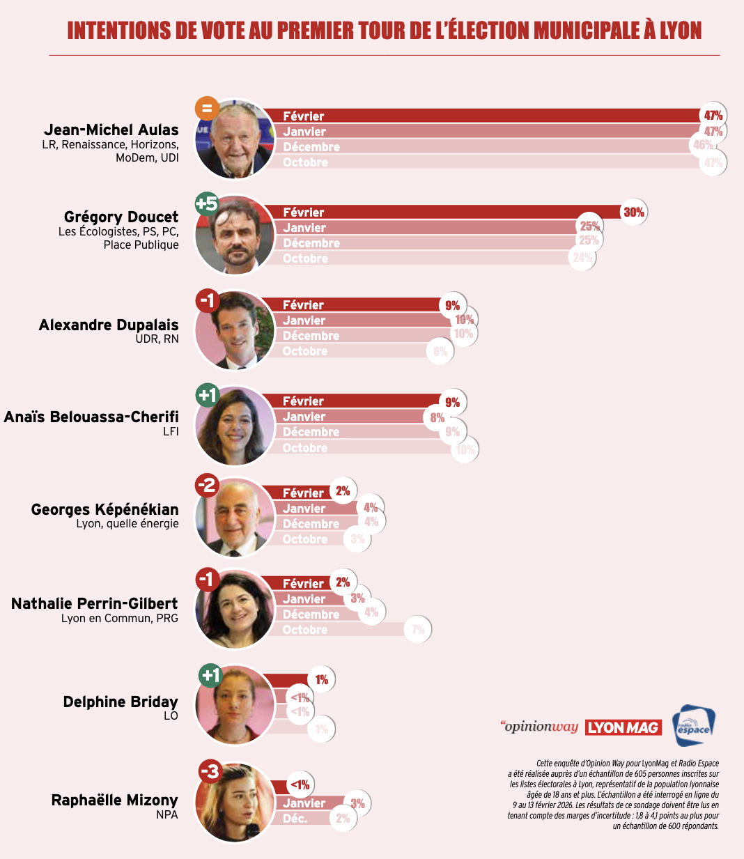 Enfin, last but not least, Jean-Michel Aulas confirme ses 47% d'intentions de vote, score obtenu trois fois depuis octobre dans les différents panels d'OpinionWay (qui changent entre chaque vague, ndlr). Quoi qu'il dise, qu'il disparaisse des radars pendant les vacances scolaires, les Lyonnais veulent l'envoyer à l'Hôtel de Ville. Une destination martienne incontournable !