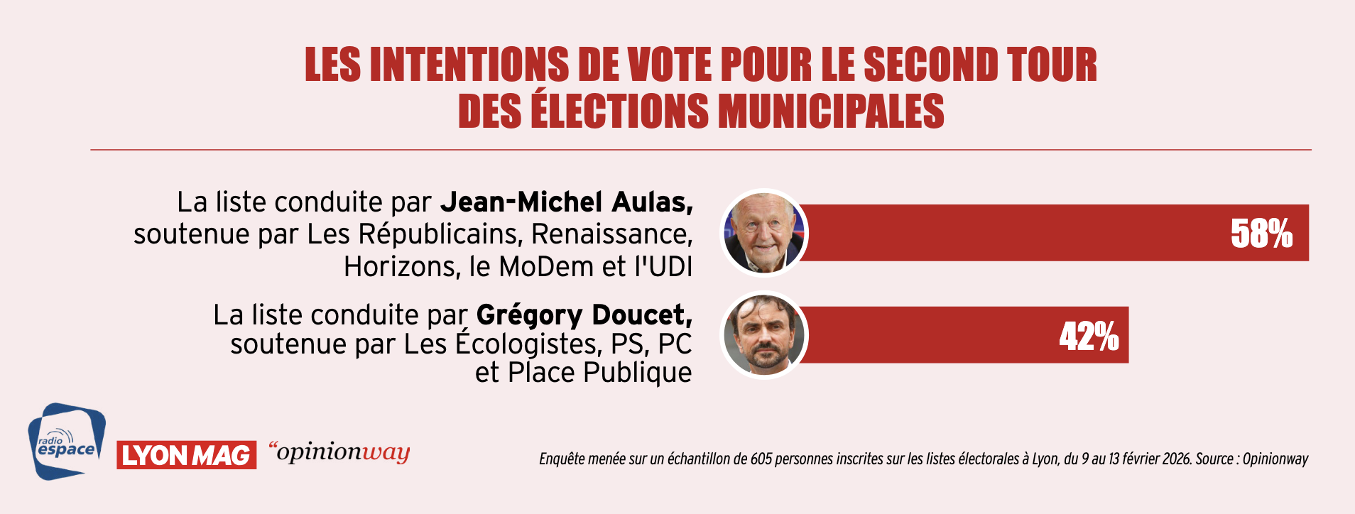 Bien que le reste des candidats engagés, hors Dupalais, soient de gauche, Jean-Michel Aulas améliorerait de plus de 10 points son score du premier tour d'un dimanche à l'autre, obtenant 58% d'intentions de vote au second tour.