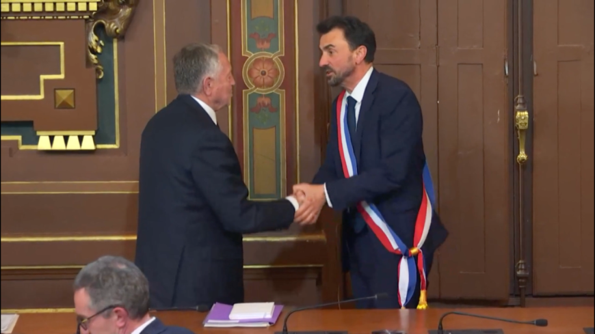 "Je mentirais en disant que j'avais imaginé cette scène il y a quelques mois. Je ne vous attendais pas à cette place, ni moi à la mienne". Dès le début de son discours, après avoir remis l'écharpe de maire à Grégory Doucet, Jean-Michel Aulas a donné le ton.