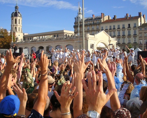Difficile pour l'instant de dénombrer le nombre de particpants à ce bouquet final. Au doigt mouillé, on tablerait bien sur 5 000 personnes, tant la Place Bellecour était noire de monde. Une grande estrade devant l'Office du Tourisme permettant aux animateurs de disséquer la chorégraphie pour le grand public, et c'est parti. Au son des violons et des accordéons de l'orchestre, sur un faux-air klezmer terriblement entrainant, tous se sont lâchés. Il faut dire que cette tarentelle napolitaine se prêtait particulièrement bien à ce genre d'exercice. Un, deux trois, quatre, à gauche, à droite! On s'écrase les pieds, on se fait des mimiques, on mime les mouvements. Certains sèchent mais qu'importe, il faut bouger. Après trois reprises de la chorégraphie, la foule se disperse. Place maintenant aux spectacles. Jusqu'au 3 octobre, quelque quarante compagnies proposeront près de 170 représentations, dont plusieurs premières européennes ou mondiales. Plus d'infos sur www.biennaledeladanse.com.