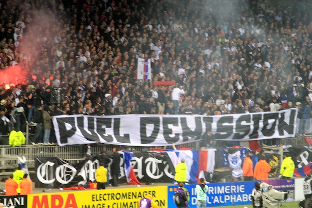 La conférence de presse d’après match touche à sa fin. Minuit approche et Gerland s’apprête à s’endormir, seuls la presse, les joueurs et l’imposant dispositif de sécurité s’affairent autour de l’enceinte, les spectateurs ayant évacué le stade. Mais c’est sans compter sur le noyau dur du Virage Nord. Restés à leur place, plusieurs centaines de membres des Bad Gones, bâche « Puel démission » en tête, crient toujours leur rage d’avoir été battus à domicile par l’ennemi juré. La défaite de trop. Les insultes volent avec le seul Claude Puel dans la ligne de mire. Les supporters font du manager sportif de l’OL le responsable principal du départ catastrophique du club en championnat (5 points après 7 journées, 4 buts marqués, une seule victoire pour 4 défaites et 2 nuls et une 19e place au classement). C’est alors que se produit une scène improbable : le président Jean Michel Aulas décide d’aller au devant des supporters. Entouré de stadiers, il se dirige vers le bas de la tribune. Le kapo des Bad Gones demande alors le silence et transmet le micro à Aulas. Le président, diplomate, commence à tenter de les amadouer : « merci d’avoir permis aux joueurs de pouvoir s’entraîner normalement cette semaine. Ne vous laissez pas influencer par un certain nombre de journalistes qui ne font qu’attiser la tension ! Le club, les joueurs, tout le monde a besoin de vous. Si on est parvenus au sommet c’est aussi grâce à vous ! » Les spectateurs le sifflent. Ils veulent du concret, à savoir l’annonce du limogeage de Claude Puel. Ils le font savoir en reprenant leur chant de plus belle. Aulas hausse alors le ton et garde le micro malgré les sifflets : « vous avez vu comme moi qu’on a une équipe de grande qualité. Ce soir il y avait un bon état d’esprit, les joueurs ont tout donné. On n’avait plus perdu contre les Stéphanois depuis 17 ans, maintenant on a un match de Ligue des Champions très important la semaine prochaine, pas comme l’ASSE qui la joue sur Playstation la coupe d’Europe ! » Quelques salves d’applaudissements saluent ce trait d’esprit. « Si l’un d’entre vous veut prendre ma place, qu’il vienne ! » lance-t-il en se rapprochant de la tribune.