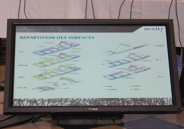 Cette présentation était animée. « Ce qui est sûr c'est qu'il n'y aura plus aucun acte médical pratiqué dans le bâtiment de l'Hôtel-Dieu. C'est une condition inscrite dans le cahier des charges des HCL. Nous n'avons pas développé les hôpitaux à Bron et à Lyon Sud pour le refaire ici » met au clair Gérard Collomb. Quand on lui exprime les réserves du cardinal Barbarin pour qui ce lieu devrait à tout prix garder un rapport à sa vocation initiale qu'est l'assistance apportée aux plus démunis, il porte l'estocade: « je suis comme Mgr Barbarin. J'ai à la fois les espérances du ciel et les contraintes de la terre ». Seul le musée devrait être conservé dans tous les cas: 1000m² pour Nexity, 4000 pour Eiffage. Le système de décision a été par ailleurs vilipendé par Denis Broliquier, maire du 2e arrondissement et membre du comité de pilotage. Il s'est abstenu de voter la délibération sur le choix des finalistes, estimant que « comme d'habitude, c'est Gérard Collomb qui décide seul. On apprenait le contenu de la délibération le matin dans les journaux ». Il est lui pour une participation de fonds public à ce projet et affirme avoir reçu plus d'un millier de lettres lui réclamant de conserver l'esprit du lieu, pétition entendue puisque les deux promoteurs encore en liste gardent la totalité des corps de bâtiment. Collomb terminera en assurant que « ce sera un succès, comme pour la Confluence devant laquelle s'extasiait récemment la presse parisienne. »