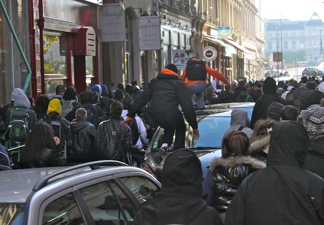 L’important dispositif de sécurité est resté mobilisé dans le centre ville de Lyon où le rassemblement des jeunes s’est effectué place Bellecour aux alentours de 9h. Deux véhicules des CRS munis de lances à eau ont été mis à disposition des forces de l’ordre. Ces véhicules, qui dépendent de la zone sud-est, étaient mobilisés la veille à Deauville. La foule a tenté de de rejoindre les Terreaux vers 9h45 mais a été repoussée par les CRS au niveau des Cordeliers. De retour sur Bellecour, les jeunes ont finalement pris la direction de la place Antonin Poncet. Redescendant par la rue de la charité vers la place Gailleton, les jeunes ont brisé les vitrines de certains commerces, alors que plusieurs véhicules ont été endommagés. Certains jeunes ont pu traverser le Rhône par le pont de l’université. Rue Salomon Reinach, les casseurs s'en sont pris à nouveau aux véhicules stationnés. Les jeunes sont ensuite retournés place Bellecour. Les hommes en noir du GIPN ont quitté les camions. Plusieurs charges de CRS ainsi que des tirs de gazs lacrymogènes ont eu lieu. La place Bellecour, filtrée et très difficile d'accès, a été utilisée telle une souricière pour immobiliser les casseurs.