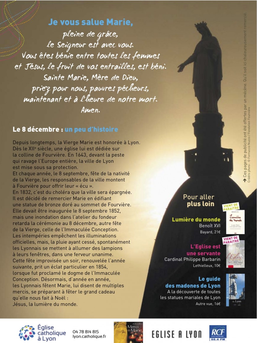 Quatre pages réservées pour le quotidien du 8 décembre, le diocèse s’était pourtant donné les moyens de son ambition : rayonner auprès de ses fidèles. Véto immédiat du côté de 20 Minutes, l’antenne lyonnaise et la direction parisienne du quotidien gratuit refusant la publication publicitaire, qui reprenait le texte intégral de la prière Je vous salue Marie. Un contenu relevant plus de l’opinion que de l’information, selon ces derniers.