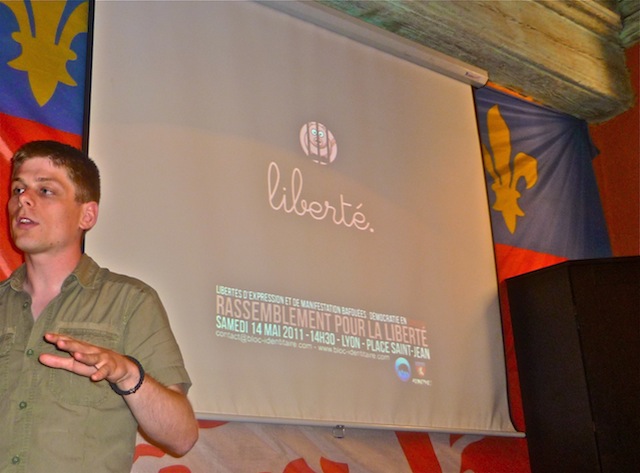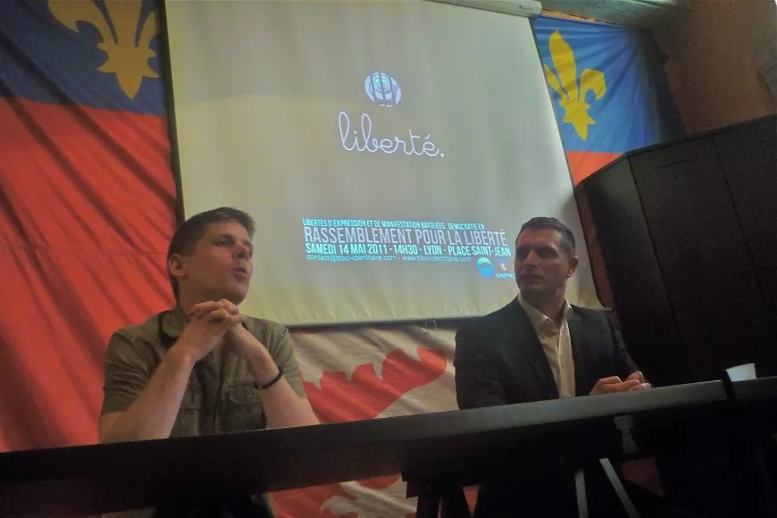 Arnaud Gouillon a 25 ans. Il est ingénieur et candidat Identitaire aux Présidentielles de 2012. Son voisin de table s’appelle Fabrice Robert. Il est depuis le 6 avril 2003 le président du Bloc Identitaire, qui regroupe les diverses entités régionales qui composent le mouvement. Si ces deux huiles d'un parti « localiste », comme ils le définissent, ont convié la presse lundi dans le QG lyonnais, c’est qu’ils ne s’expliquent pas pourquoi les pouvoirs publics trouvent le cochon si indigeste. En particulier lorsqu'il manifeste.