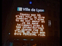 Vous allez voir défiler ce mardi des mots doux sur les 37 panneaux lumineux géants de la ville de Lyon.Les messages avaient été postés sur le site internet de la ville, qui les diffuse aujourd'hui. Ils sont à retrouver jusqu'au 20 février sur Lyon.fr. Par ailleurs, 200 roses seront offertes aux femmes toute la journée au pavillon de l'office de tourisme place Bellecour.