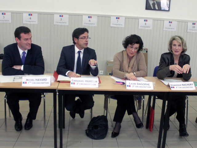 Michel Havard, Emmanuel Hamelin, Laure Dagorne et Dominique Nachury, respectivement candidats dans les 1ère, 2ème, 3ème et 4ème circonscriptions du Rhône, veulent montrer aux électeurs qu’ils sont "unis et mobilisés pour les deux échéances qui arrivent". "Nous nous présentons dans des circonscriptions différentes, et donc des territoires différents, mais nous avons les mêmes idées et mêmes objectifs" explique Michel Havard. Une manière aussi de faire taire les ragots au sujet de Nora Berra. "Je me sens investie d’une responsabilité" confie Laure Dagorne pour commenter sa nomination pour la 3ème circonscription. Quant à la candidature de Fabienne Levy dans la 2ème circonscription, Emmanuel Hamelin affirme ne pas en avoir peur. Pour ce qui est de la division de la gauche dans la circonscription de Michel Havard, celui-ci affirme qu’il "ne se servira pas de la faiblesse de ses adversaires pour faire campagne. Qu’ils se débrouillent entre eux". Tous se sont dit confiants face aux deux échéances électorales qui arrivent. Les quatre candidats ont également prévu de donner un meeting commun, fin mai pour montrer, encore une fois leur union et exposer leurs idées aux Lyonnais.