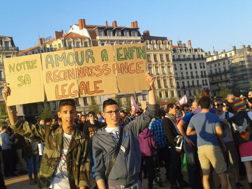 Pour fêter le vote de l'Assemblée Nationale, quelques milliers de personnes homosexuelles, de militants LGBT, de politiques mais aussi de citoyens en liesse se sont rassemblés place Bellecour. Cris de joie, champagne sabré, c'était pour eux la fin d'un long combat noyé ces derniers mois par les actions des anti.