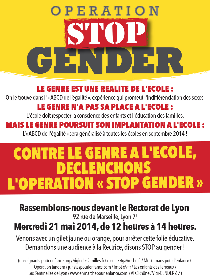 Signaler RépondreCes listes manifesteront leur soutien au combat du Collectif "NON au Gender à l'Ecole" pour l’arrêt de l’expérimentation de l’ABCD de l’Egalité, par la présence de leurs têtes de listes ou de colistiers, mercredi, devant le Rectorat.