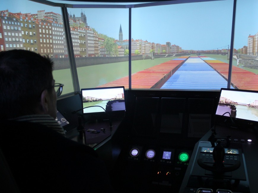 Au total, il reproduit 70 km de navigation, sur 9 sites réputés délicats à naviguer sur le Rhône et 6 autres sur la Saône. Parmi eux, l’île Barbe, le Canal de Donzère ou encore Chalon-sur-Saône. Pour une véritable immersion, le pupitre d’un bateau est reproduit à l’identique. Il comprend notamment une vision à 240°, 75 instruments et commandes ou encore 5 vidéoprojecteurs full HD. Le rendu est bluffant. On se retrouve alors aux commandes de cinq types de bateaux, principalement des péniches et même un paquebot à passagers. La modélisation de Lyon est fidèle, on pourrait presque reconnaitre un buisson familier des quais de Saône.