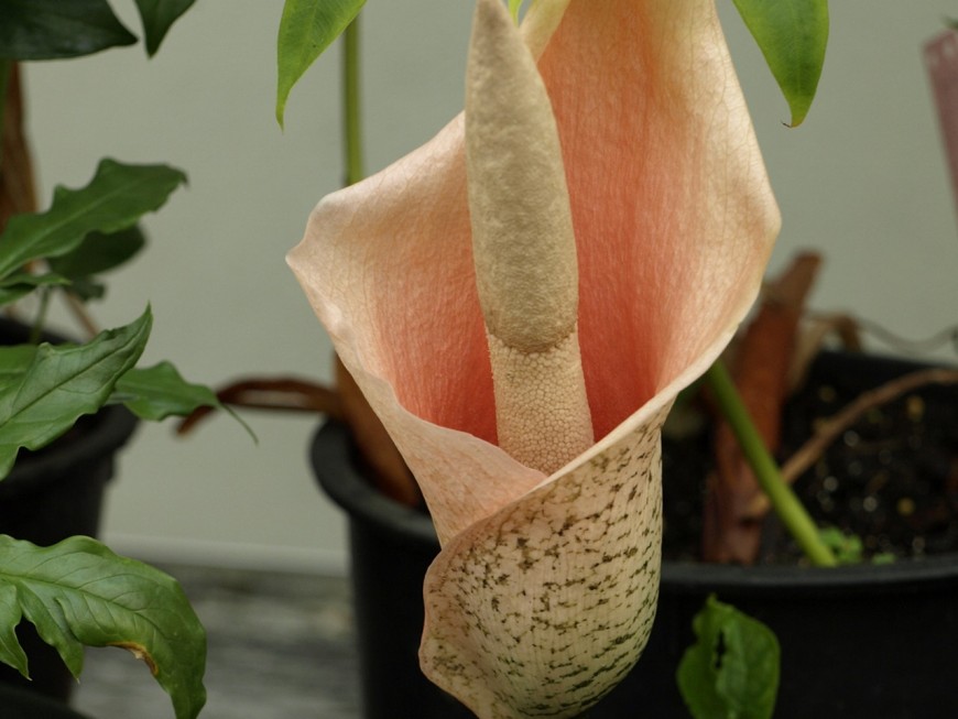 L’Amorphophallus lambii, un spécimen très rare découvert il y a seulement une trentaine d’années, fleurit en ce moment et pour une semaine environ. Cette plante, qui n’existe en culture que dans une dizaine de jardins botaniques, se caractérise par une grande feuille solitaire en forme de parasol, d’environ 2 mètres.