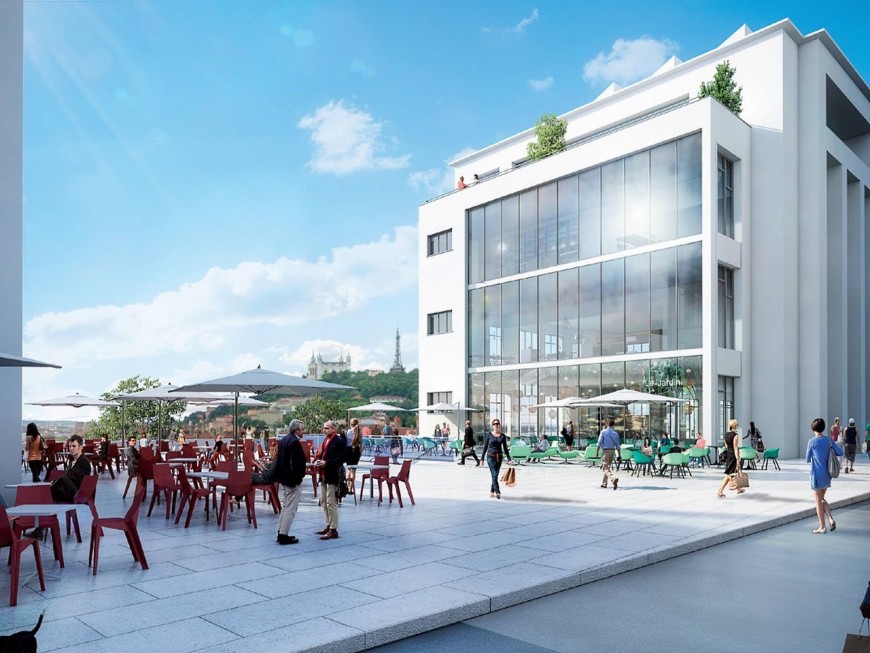 Gérard Collomb a notamment fait la promotion de la future terrasse publique où les cafés et les restaurants proposeront un panorama sur Lyon et la colline de Fourvière. Avec accès au Jardin des Plantes.