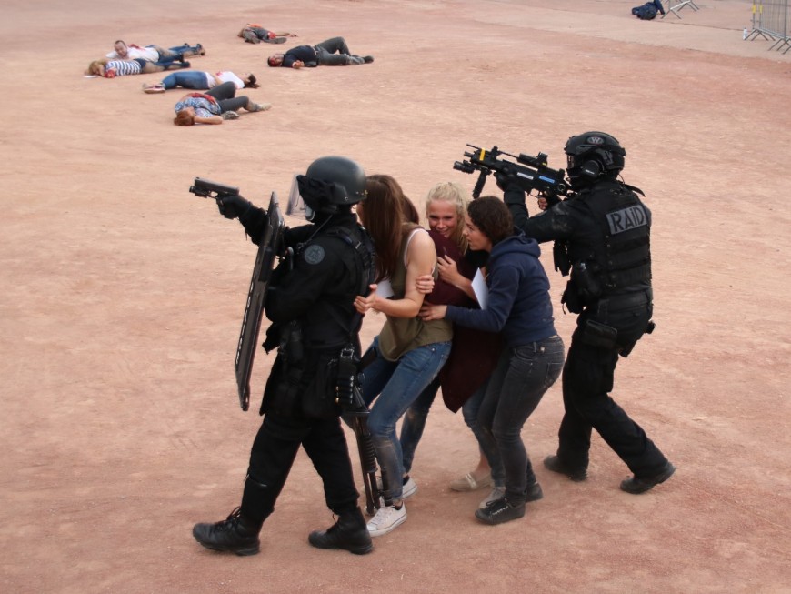 Avant d’être abattus, les deux tueurs toucheront de nombreuses personnes. Ensuite, les policiers doivent sécuriser la zone avant d’accorder l’autorisation aux secours d’intervenir. Cette partie de l’exercice prend un certain temps. Les opérations sont dirigées depuis le PC sécurité basé Rue Pizay. Les survivants sont exfiltrés, les moindres recoins fouillés. Il faut s’assurer qu’aucun risque supplémentaire n’est encouru.