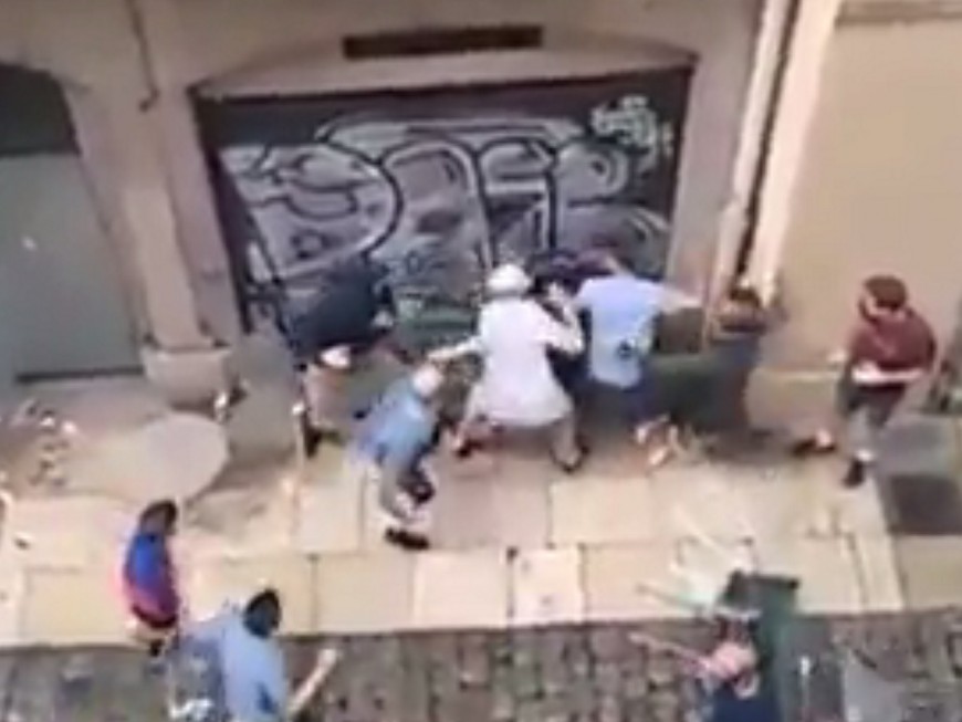 Un homme est notamment pris à partie contre une porte et est roué de coups par plusieurs individus avant que des badauds ne viennent s'interposer. Des jets de bouteilles et de chaises sont à déplorer.