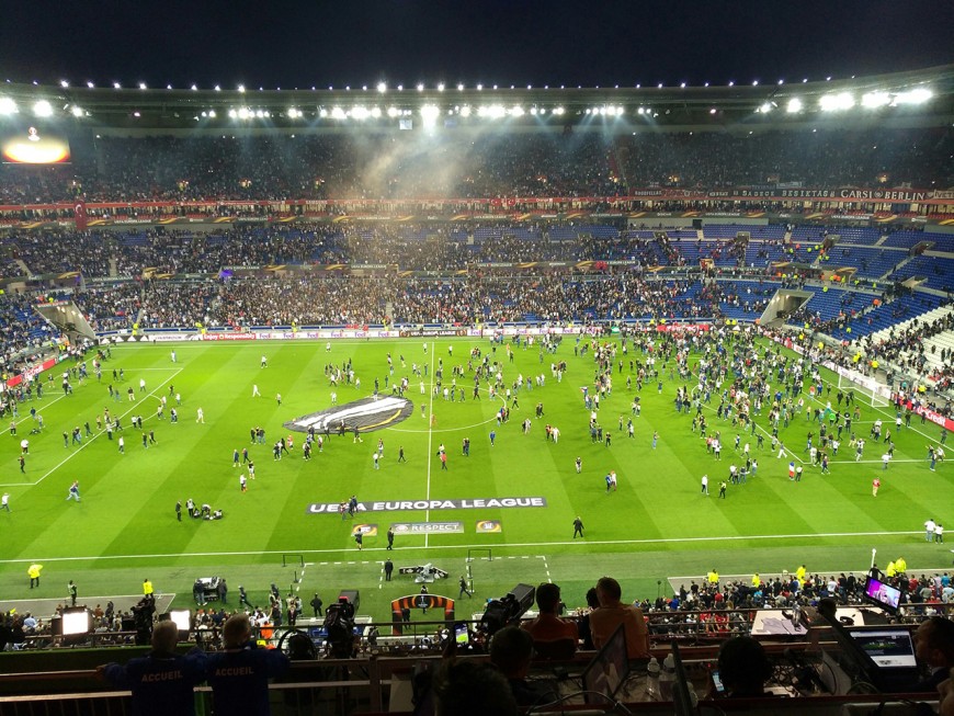 20h50 : La pelouse a été envahie par les supporters lyonnais, pour éviter des affrontements des Turcs en tribunes et des jets de pétards en virage sud. Le président de l'OL Jean-Michel Aulas est descendu également pour raisonner les fans.
