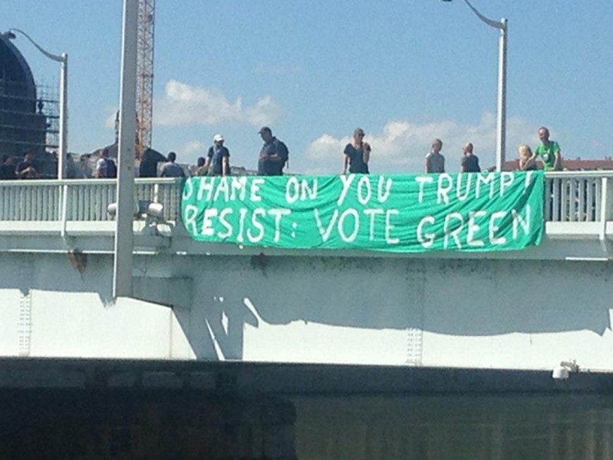 “Shame on you Trump ! Resist : vote green”, pouvait-on lire sur la banderole. Les membres d’EELV Lyon voulaient dénoncer "l’écocide en cours suite à la décision du président américain de se retirer des accords de Paris".