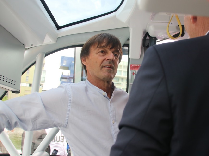 Chargé de la Transition écologique et solidaire au sein du gouvernement, l'ancien animateur TV visitait le quartier de la Confluence et s'offrait une virée en Navly, la navette électrique sans chauffeur.