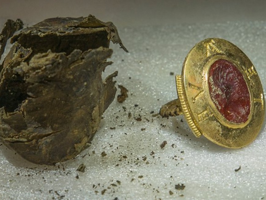 Ont notamment été mis à jour plus de 2 200 deniers et oboles en argent, datant probablement de la première moitié du XIIe siècle, 21 dinars musulmans en or, frappés au début du XIIe siècle en Espagne et au Maroc, mais aussi une feuille d’or ou encore un anneau sigillaire en or, orné d’une intaille antique de couleur rouge figurant le buste d’un dieu et comportant une inscription.