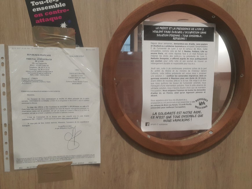 Ce lundi, deux agents de police se présentent devant les portes de l’amphi C de l’Université Lyon 2 à Bron occupé par les migrants, pour y scotcher un référé en vue d’une audience "fixée au 13/12/2017". Ce mercredi matin.