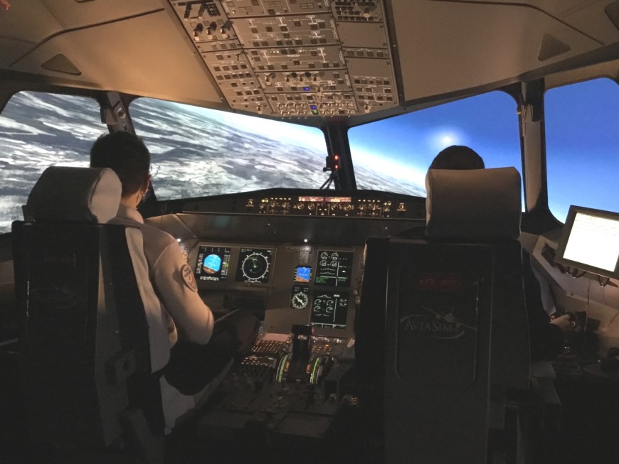 Par deux, les futurs policiers vont d’abord apprendre à décoller et atterrir sur l’aéroport de Lyon Saint-Exupéry, fidèlement reproduit sur les écrans. Après être revenu au sol, les deux pilotes sont briefés pour conduire l’avion de ligne de la capitale des Gaules jusqu’à Genève. Pour que l’exercice soit encore plus immersif, un formateur se trouve dans une autre pièce et prend le rôle de la tour de contrôle. Le décollage se déroule sans encombre, mais très vite des problèmes surgissent.