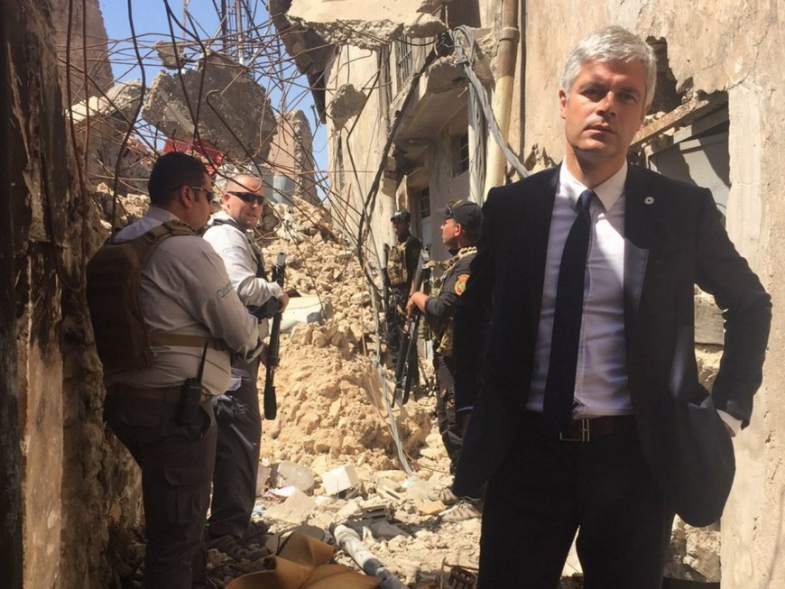 Alors que Laurent Wauquiez effectue un déplacement de quatre jours à Mossoul en tant que président d'Auvergne-Rhône-Alpes, il a été pris en photo devant un bâtiment en ruines.