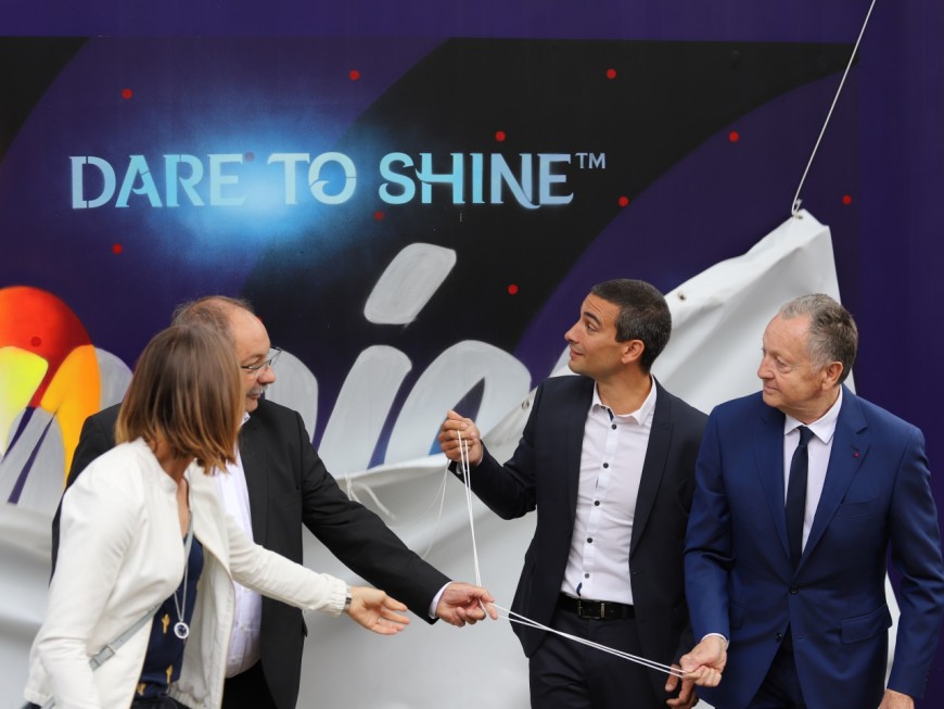 Yann Cucherat, adjoint au Maire délégué aux sports, Camille Abilly, ancienne joueuse de l'OL, Guy Barral, vice-président de la Métropole et Jean-Michel Aulas, président de l'OL, ont dévoilé ensemble l'œuvre.