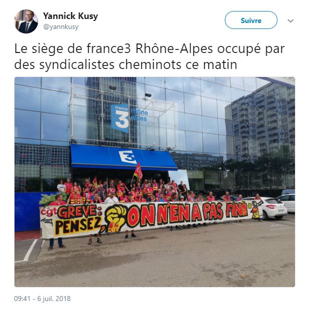La réforme de la SNCF a beau avoir été entérinée par un vote, la contestation se poursuit. Les cheminots continuent de se mobiliser pour dire tout le mal qu'il pense de cette réforme. Ce vendredi, entre 40 et 50 d'entre eux se sont rassemblés devant les locaux de France 3, dans le quartier de la Part-Dieu. Ils ont ensuite envahi le bâtiment, action qu'ils avaient déjà menée dans le passé afin de demander la tenue d'un débat.