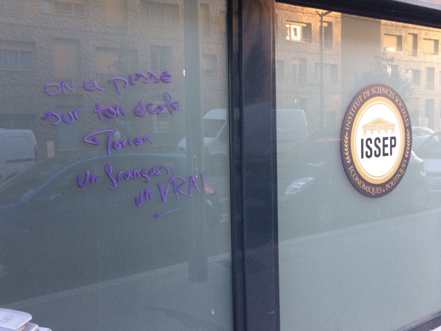 "On a pissé sur ton école Marion" est ainsi inscrit en violet sur la vitre de l'ISSEP. Et la délicate attention est signée : "Un Français, un vrai".