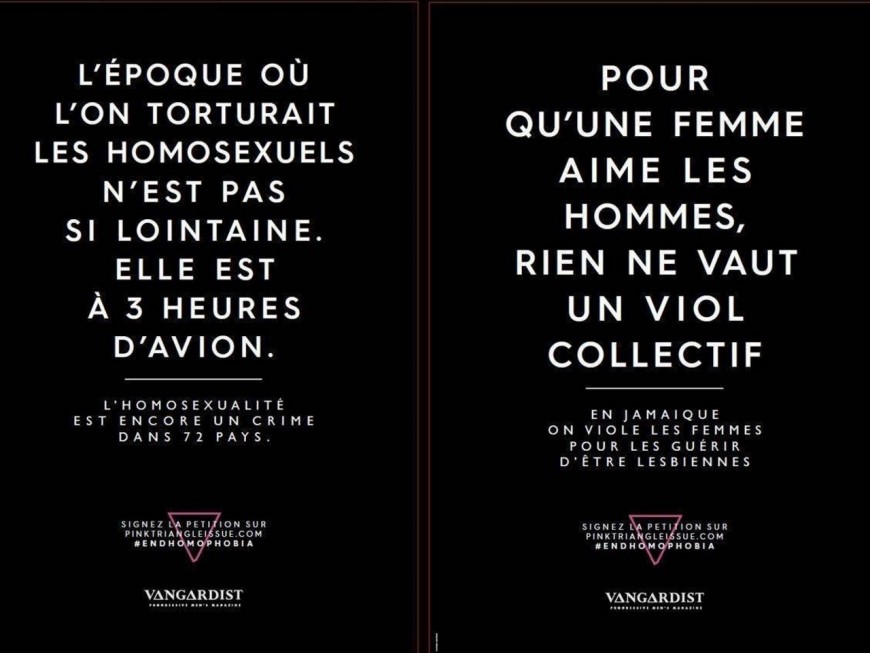 "Pour qu'une femme aime les hommes, rien ne vaut un viol collectif", peut-on lire sur l'affiche, dont le magazine autrichien Vangardist est à l'origine. En petits caractères, il est ajouté : "En Jamaïque, on viole les femmes pour les guérir d'être lesbienne".