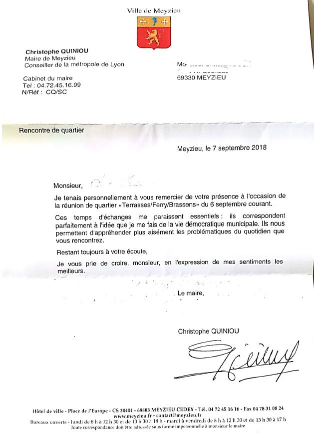 Dans l'un de ces courriers en question, daté du 7 septembre dernier, et que la rédaction a pu se procurer, le maire de Meyzieu remercie "personnellement" l'un des participants à la réunion de quartier Terrasses/Ferry/Brassens de la veille. "Ces temps d'échanges me paraissent essentiels : ils correspondent parfaitement à l'idée que je me fais de la vie démocratique municipale. Ils nous permettent d'appréhender plus aisément les problématiques du quotidien que vous rencontrez", écrit Christophe Quiniou, assurant son interlocuteur de "toujours" rester à son "écoute".