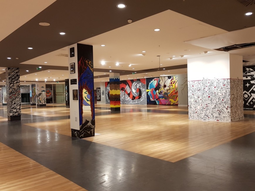 Abordant le réchauffement climatique sur des fresques murales réalisées par plusieurs dizaines d’artistes, l’exposition a été installée par l’association Superposition sur plus de 2 000 m2 au 1er étage du centre commercial.