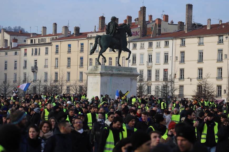 À 14 heures, ce sont un millier de personnes qui sont présentes sur la place ocre. Le cortège se forme progressivement et prend la direction des berges du Rhône. Les forces de l'ordre ont, depuis le départ des gilets jaunes, bloqué l'accès à la Place Bellecour.