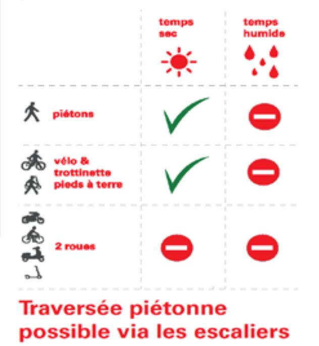Seul les piétons munit de la vignette crit’air et munit d’un casque au norme NF ainsi que les vélos ayant leur contrôle technique valide pourront emprunter cette passerelles après en avoir demander une autorisation et payer un droit de timbre .