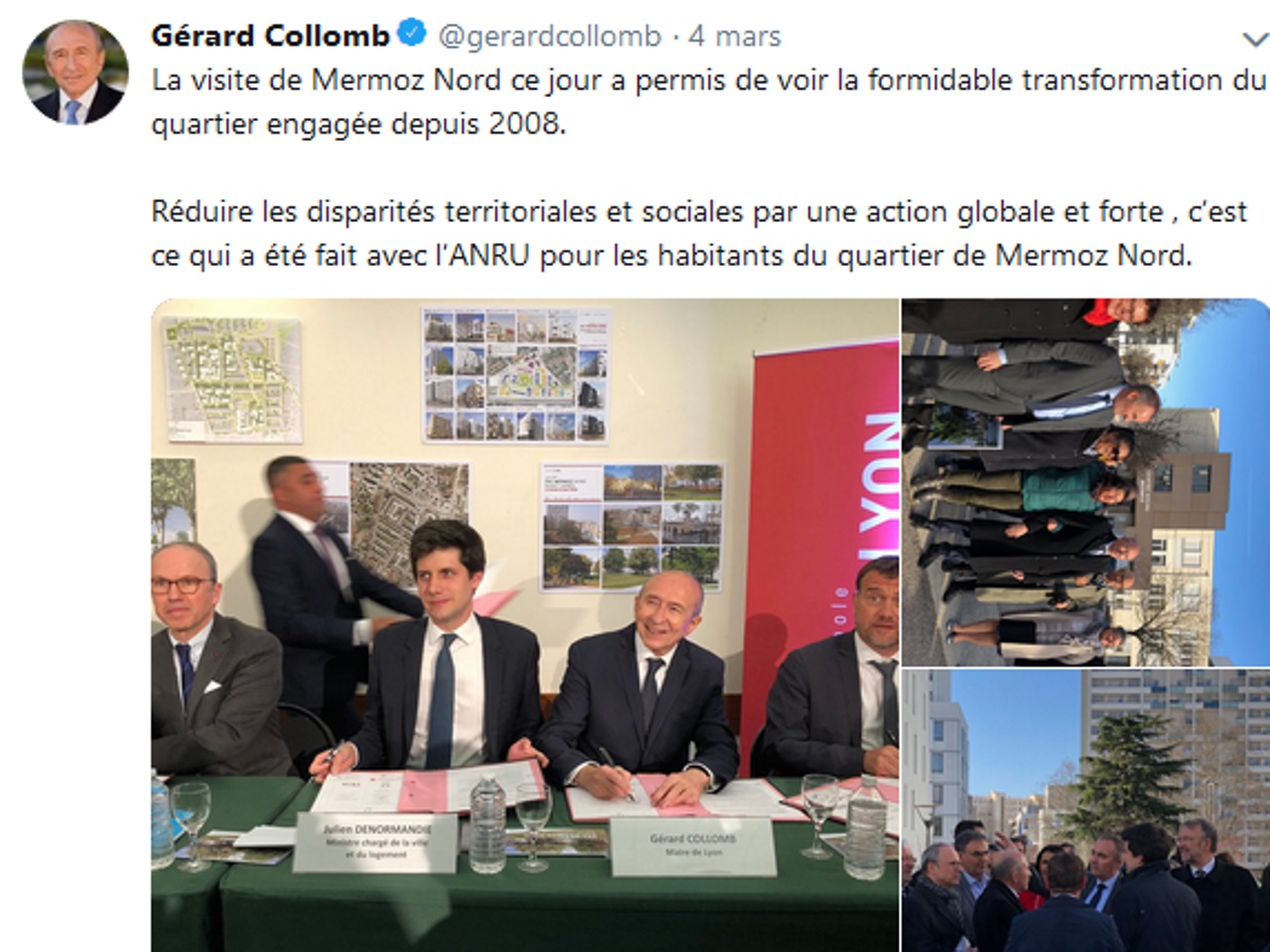 C'est la directrice de cabinet de Gérard Collomb, Arabelle Chambre-Foa, qui a pris le relais sur les réseaux sociaux en postant plusieurs photos. Avec là encore un manque de savoir-faire criant. Pour preuve une photo à l'envers lors de la visite de Mermoz Nord avec le secrétaire d'Etat Julien Denormandie.